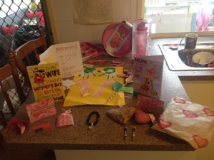 Today has been spent doing the things I love the most…10km run, kisses and cuddles while opening my presents, watching Bailey and Kaleb play footy. We had a great visit with nana who looked a million dollars today and had such a sparkle in her eye as the flowers kept rolling in. As I type, my wonderful husband is preparing roast meat for dinner with my family and I’m cuddling a scared Mia (from the electric knife lol) and keeping an eye on a very sick